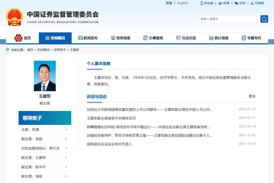 王建军同志,男,汉族,1968年3月出生,经济学硕士,中共党员。现任中国证券监督管理委员会副主席、党委委员。