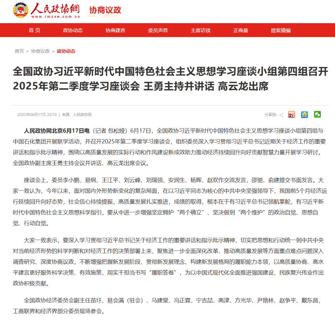 人民政协网北京6月17日电(记者 包松娅)6月17日,全国政协习近平新时代中国特色社会主义思想学习座谈小组第四组与中国石化集团开展联学活动,并召开2025年第二季度学习座谈会,组织委员深入学习贯彻习近平总书记近期关于经济工作的重要讲话和指示批示精神,围绕以高质量发展的实际行动和作风建设新成效助力推动经济持续回升向好贡献智慧力量开展学习研讨。全国政协副主席王勇主持会议并讲话、高云龙出席会议。