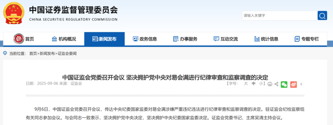 中国证监会党委召开会议 坚决拥护党中央对易会满进行纪律审查和监察调查的决定