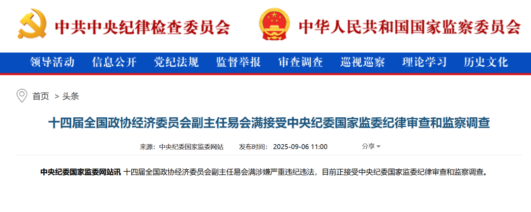 2025年9月6日周六中国证监会前主席、现在的全国政协官员易会满,因为涉嫌严重违纪违法,正被中央纪委“双规”调查。