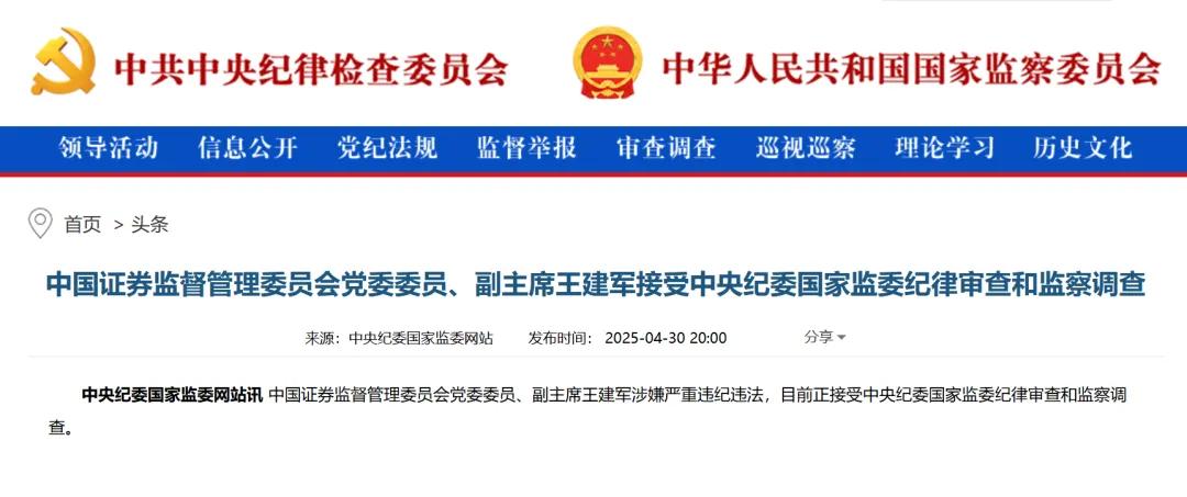 中国证券监督管理委员会党委委员、副主席王建军接受中央纪委国家监委纪律审查和监察调查
